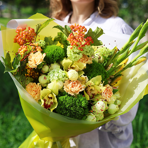 Букет "Жаркое лето" из калины, гладиолусов, кустовых пионовидных роз, диантусов и орхидей