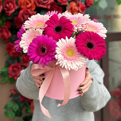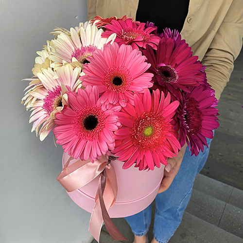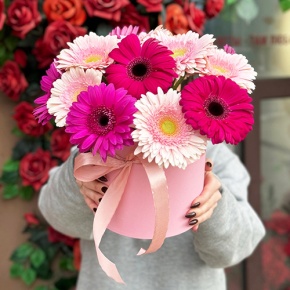Композиция в шляпной коробке из микса гербер (цвет в ассортименте)