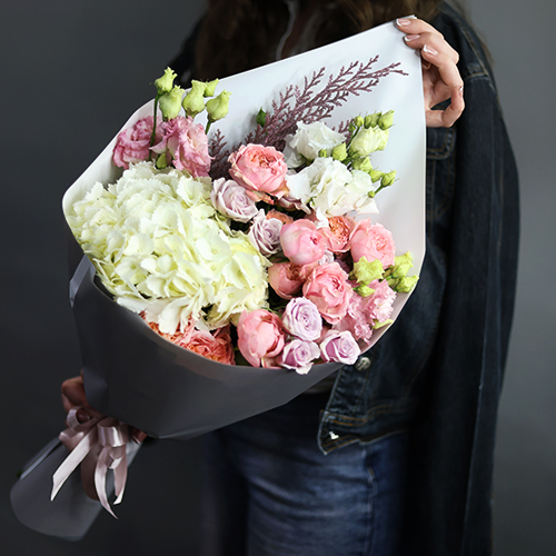 Букет "Иконика" из гортензий, кустовых пионовидных роз Джульетта и эустом